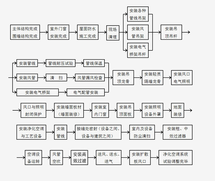 3、凈化工程設(shè)計應(yīng)為施工安裝、維護(hù)管理、測試和安全運(yùn)行創(chuàng)造必要的條件。