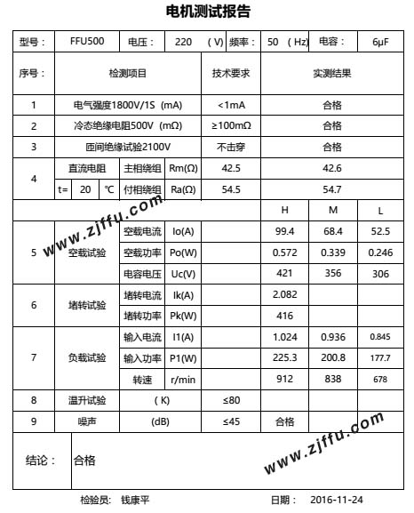 當前位置:首頁 >> 新聞咨詢 >> FFU500電機測試報告FFU500電機測試報告 型號:FFU500 電壓:220 (V) 頻率:50 (Hz) 電容:6mF 1、檢測項目:電氣強度1800V/1S (mA);技術(shù)要求:<1mA;實測結(jié)果:合格。 2、檢測項目:冷態(tài)絕緣電阻500V (mQ);技術(shù)要求:>100mQ;實測結(jié)果:合格。 3、檢測項目:匝間絕緣試驗2100V;技術(shù)要求:不擊穿;實測結(jié)果:合 …