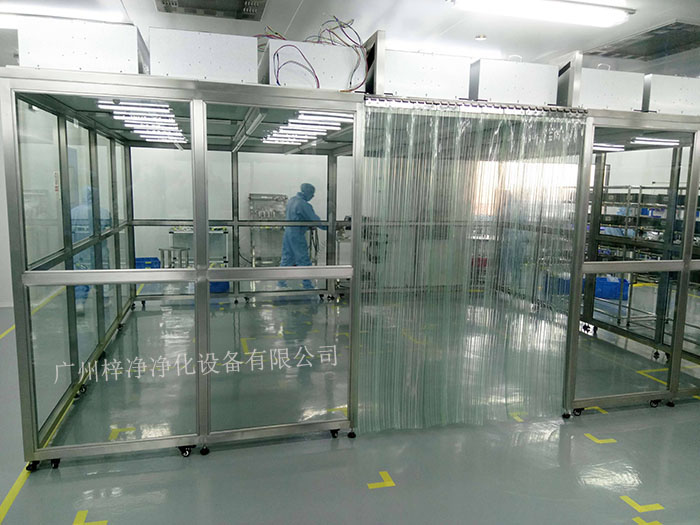 潔凈棚它主要從FFU頂部將空氣吸入,經(jīng)初效過濾器,高效過濾器過濾,過濾后的潔凈空氣在整個出風面以0.45m/s±20%的風速勻速送出到潔凈棚內(nèi)。形成均流層,使?jié)崈艨諝鈿饬鞒蚀怪眴蜗蛄?,從而保證了工作區(qū)內(nèi)所要求的潔凈度。潔凈棚等級通常分為百級潔凈棚,千級潔凈棚,萬級潔凈棚。