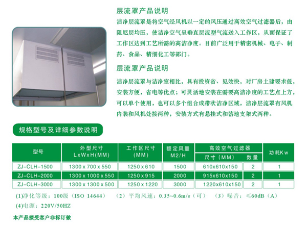 潔凈度:工作區(qū)內≥0.5μm粒徑的塵?!?.5顆/升(FS209E100級) 噪聲:≤64 Db(A) 平均風速:0.3一0.55m/s,潔凈層流罩與潔凈室相比,具有投資省,見效快,對廠房土建要求低,安裝方便,省電等優(yōu)點,目前廣泛用于精密機械 、電子、制藥、食品、精細化工等部門。